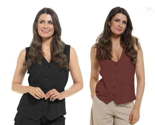 Womens Linen Blend Waistcoat Sleeveless Button Vest Tie Back UK 10–20 Rust Black