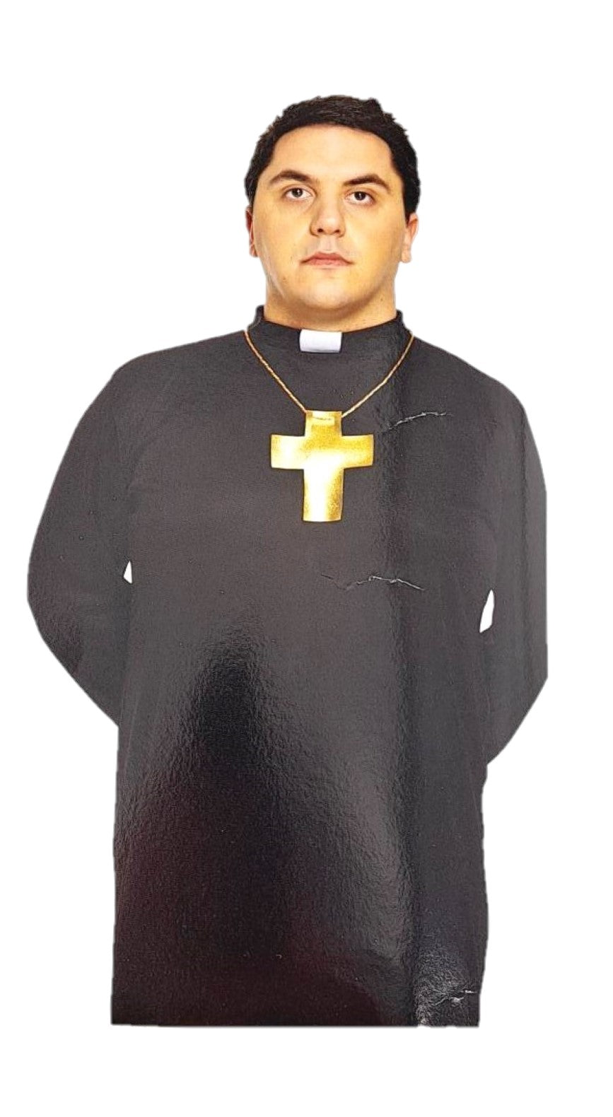 The vicar / man of the cloth/ priest fancy dress costume for men includes a long black robe with a white clerical collar and a large gold cross necklace, for adult use only.
