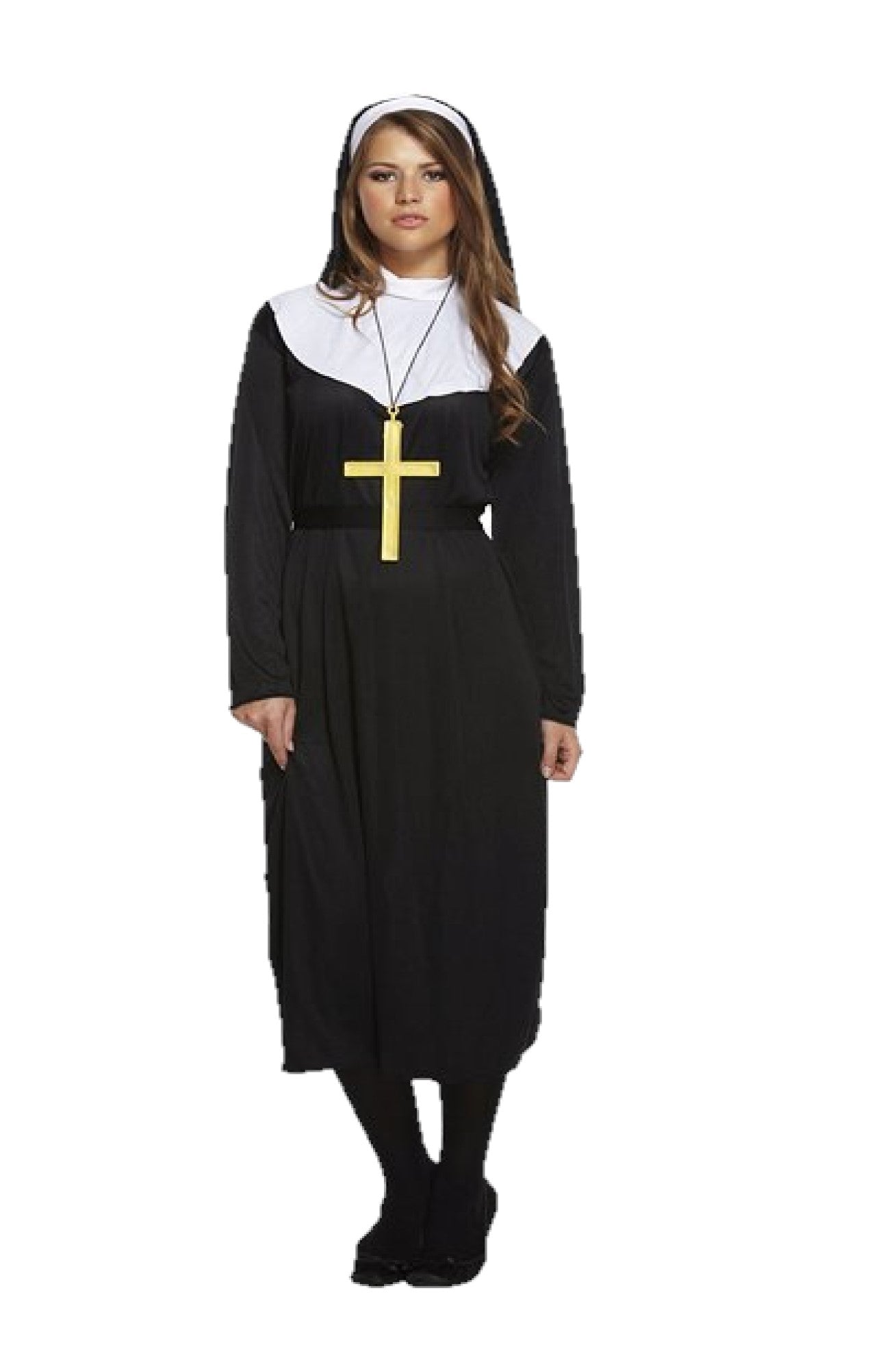 This women’s Classic Nun, mother superior costume is great for fancy dress celebrations, Sister Act, Nuns On the run, Vicars and Nuns student nights, Halloween parties and cosplay events. The nun fancy dress costume for women takes inspiration from the attire of Roman Catholic nuns, and the outfit includes a mid-calf length black dress with white overlay designed to resemble a nun’s guimpe, a black belt, and a head dress designed to resemble a nun’s veil and a large gold coloured cross.