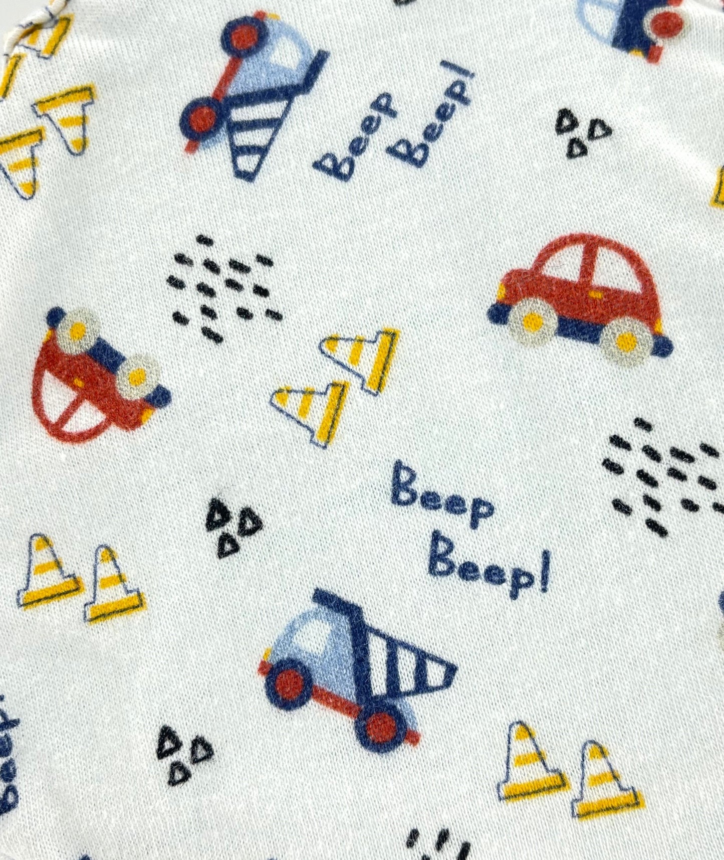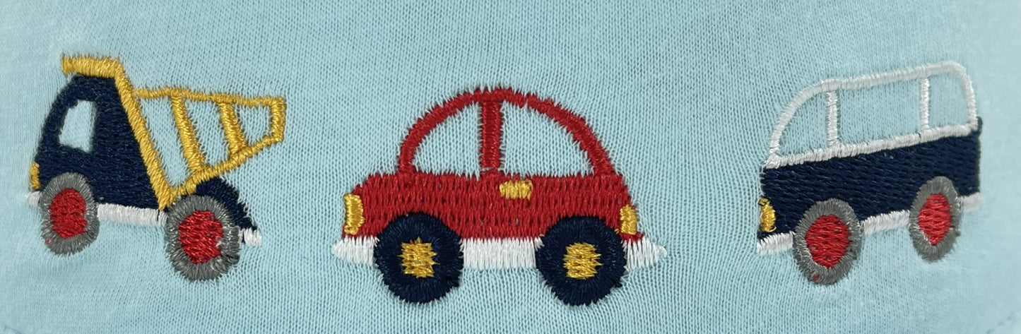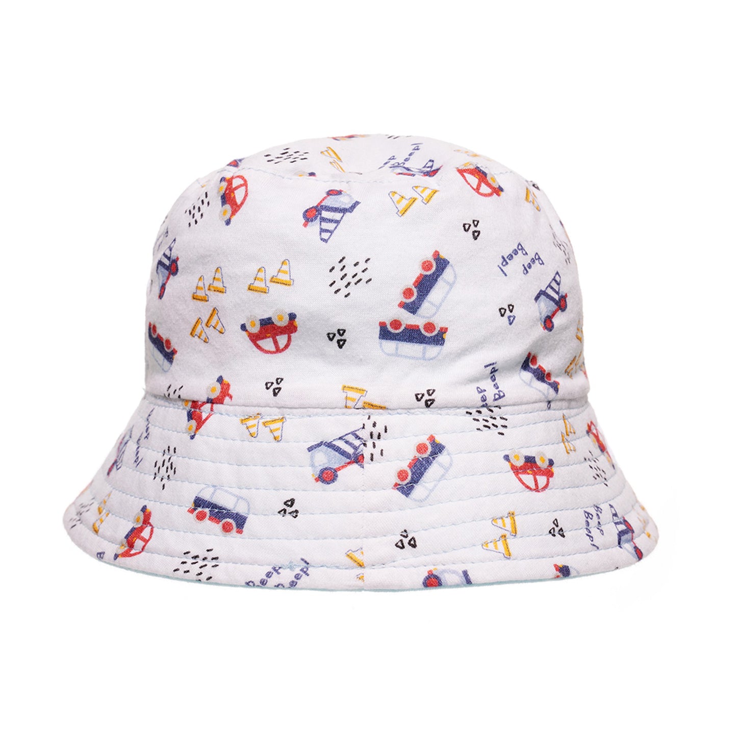 - REVERSIBLE – this cute bucket is hat is reversible - pale blue on one side with multicoloured embroidered dumper truck, car and camper van on the front, white on the other side with all-over multicoloured vehicles, “BEEP BEEP!” and traffic cone design. 2 great looks in one hat!