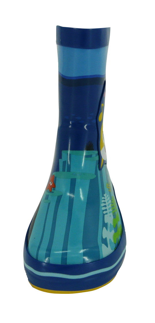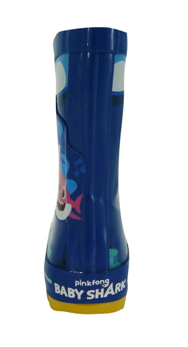 Blue rubber uppers with all over under-the-sea print, featuring Baby Shark, with Daddy Shark and Mommy Shark on outer side of each boot.