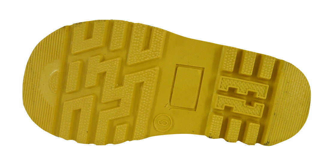 Yellow rubber soles with deap cleats to help grip in muddy or snowy conditions.