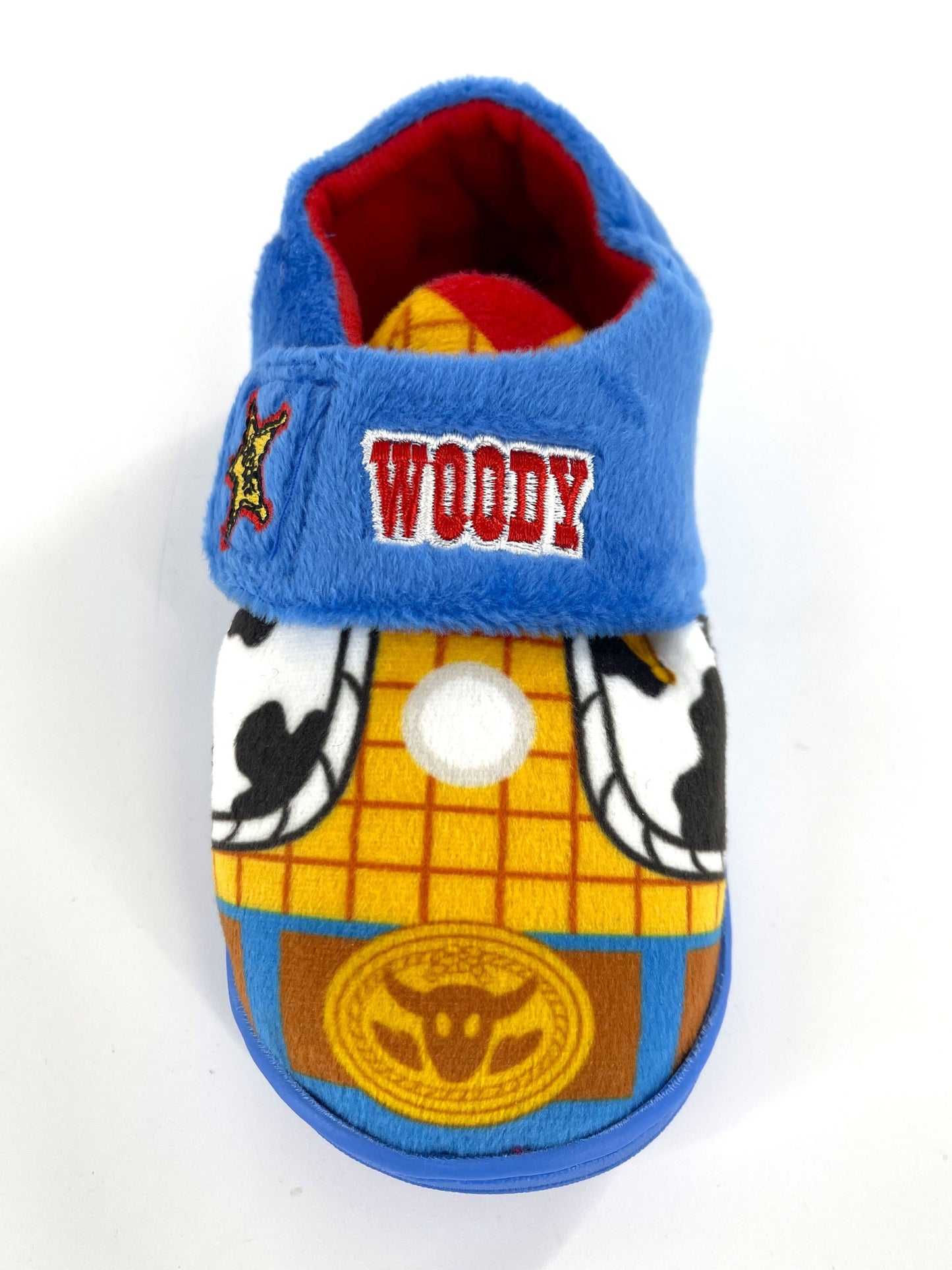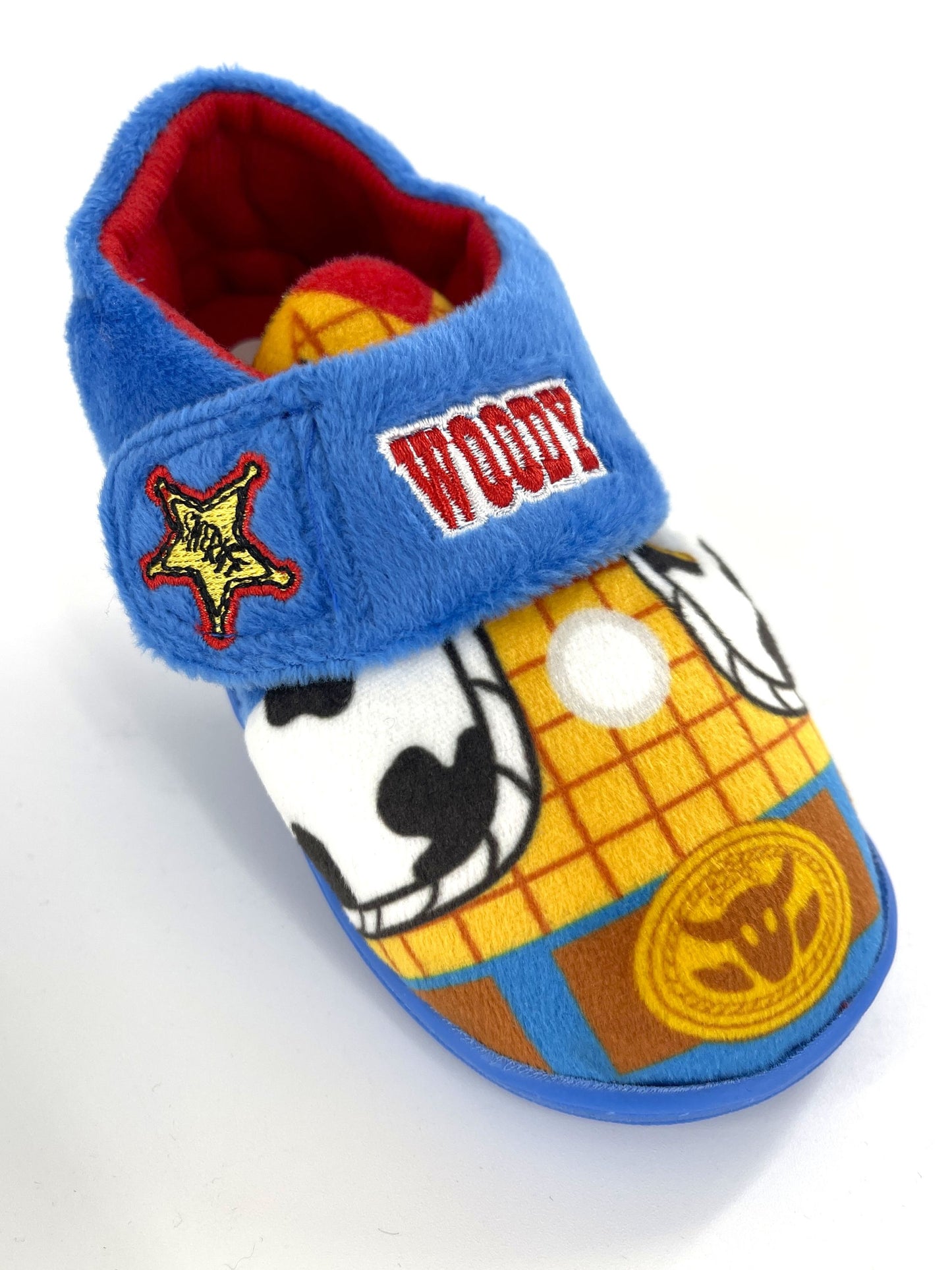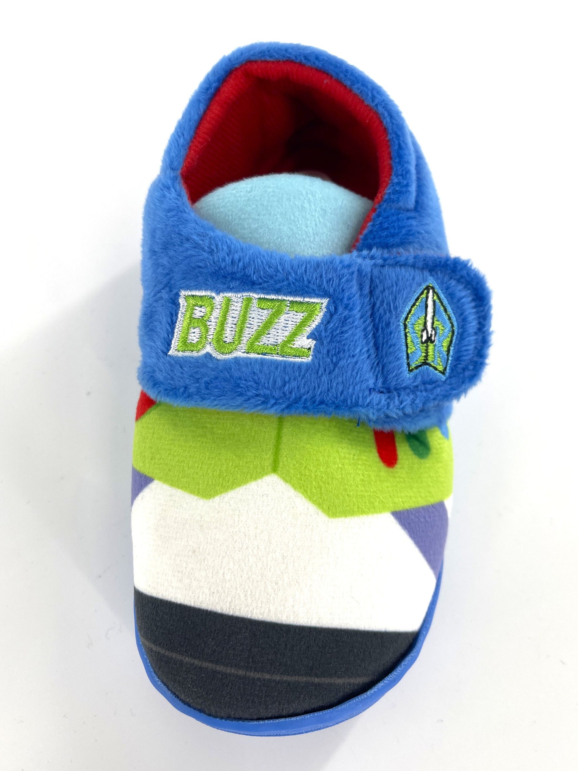 Each slipper is character-themed – one for Buzz, one for Woody!