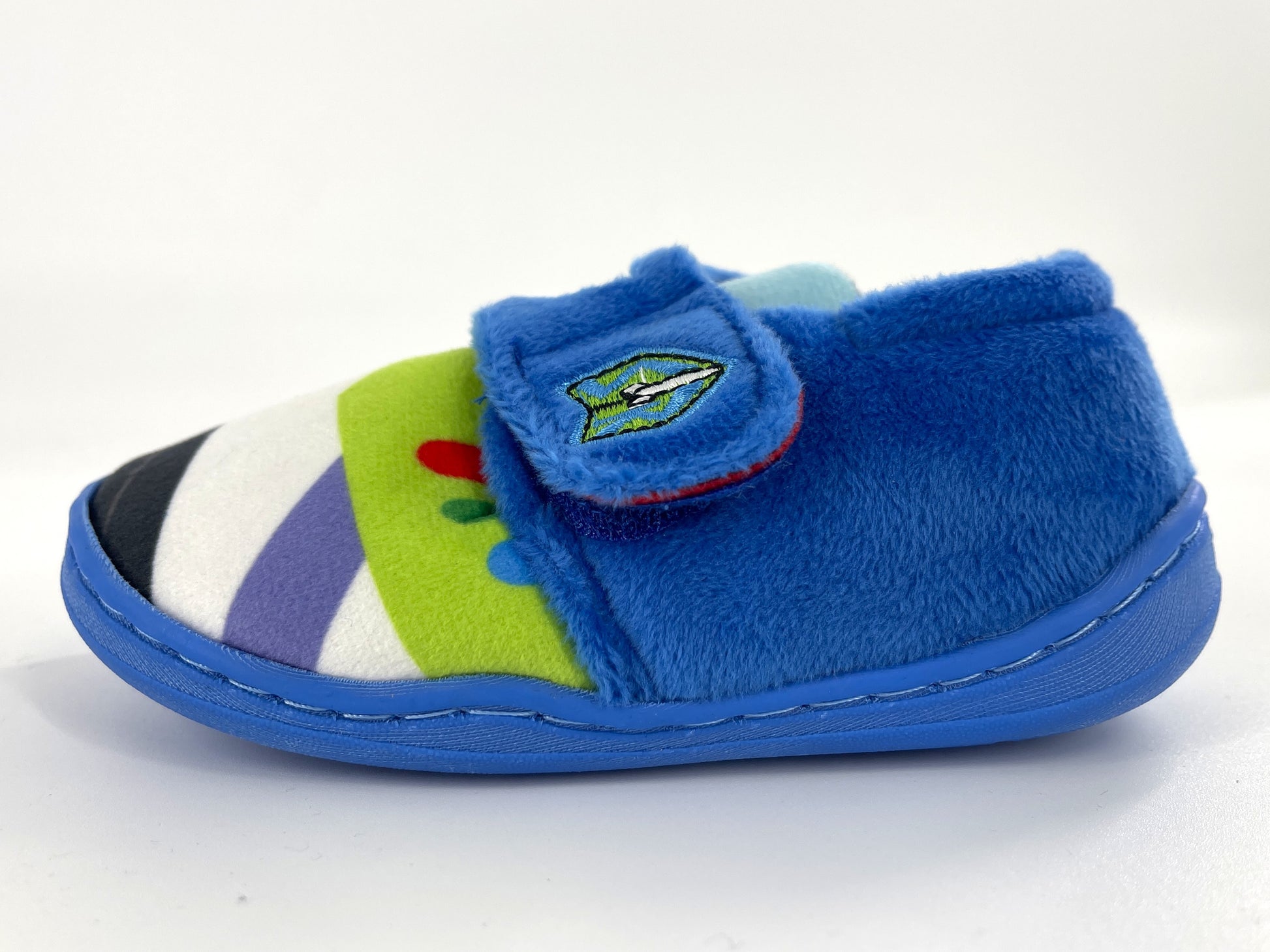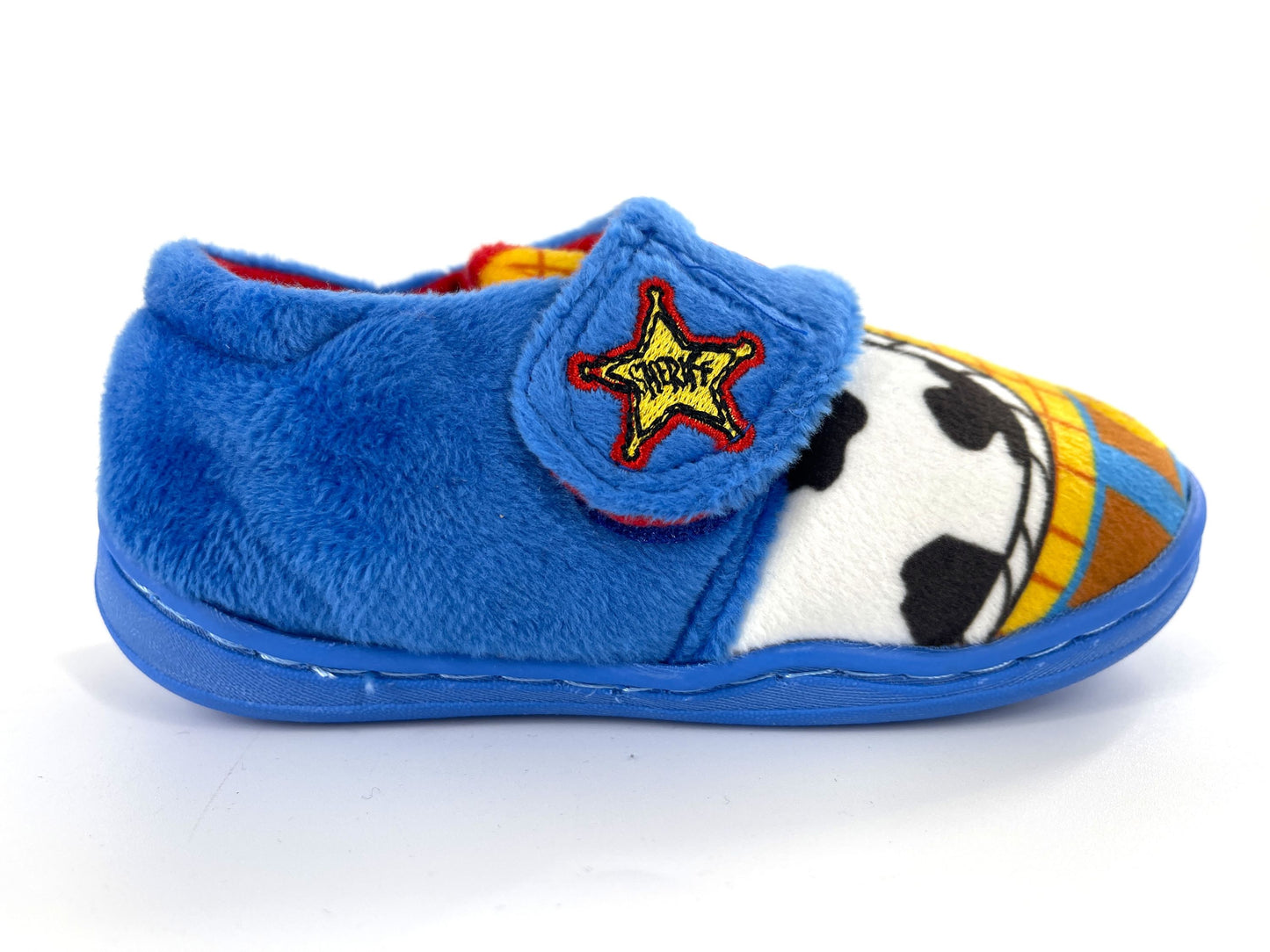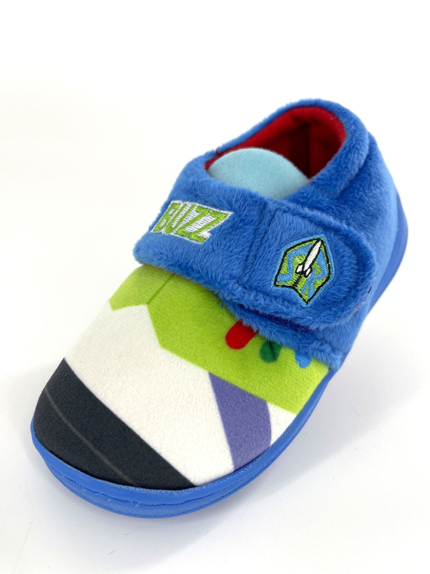 Each slipper is character-themed – one for Buzz, one for Woody!