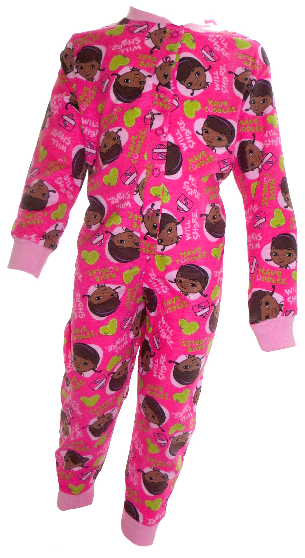 - This is a pretty Deep pink Doc McStuffins onesie is covered in images of Dottie, love hearts and the phrases Will Share and Have Cuddles written in English,