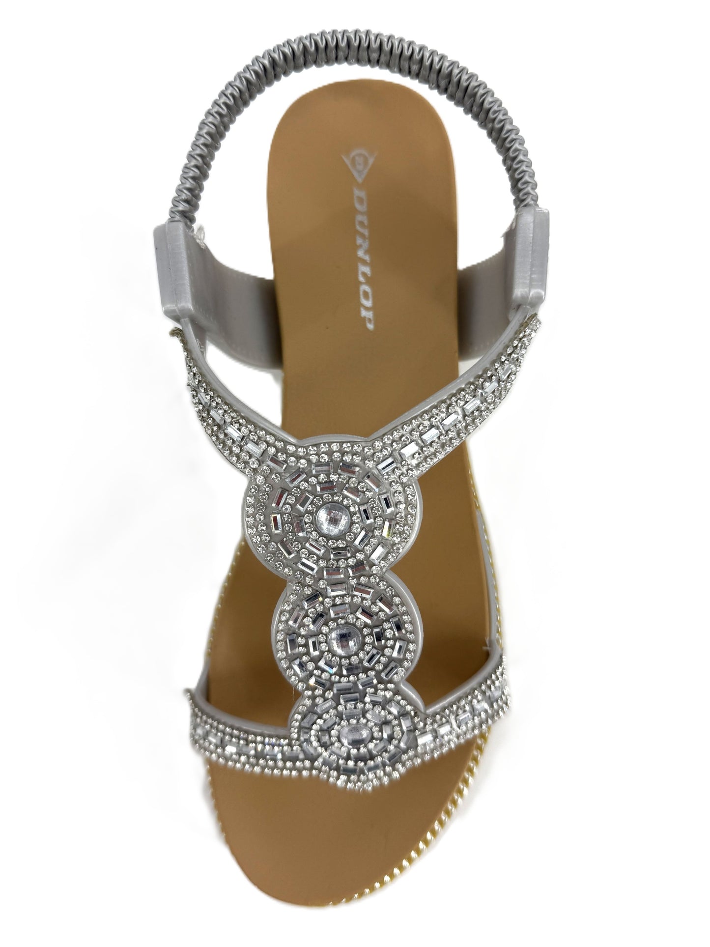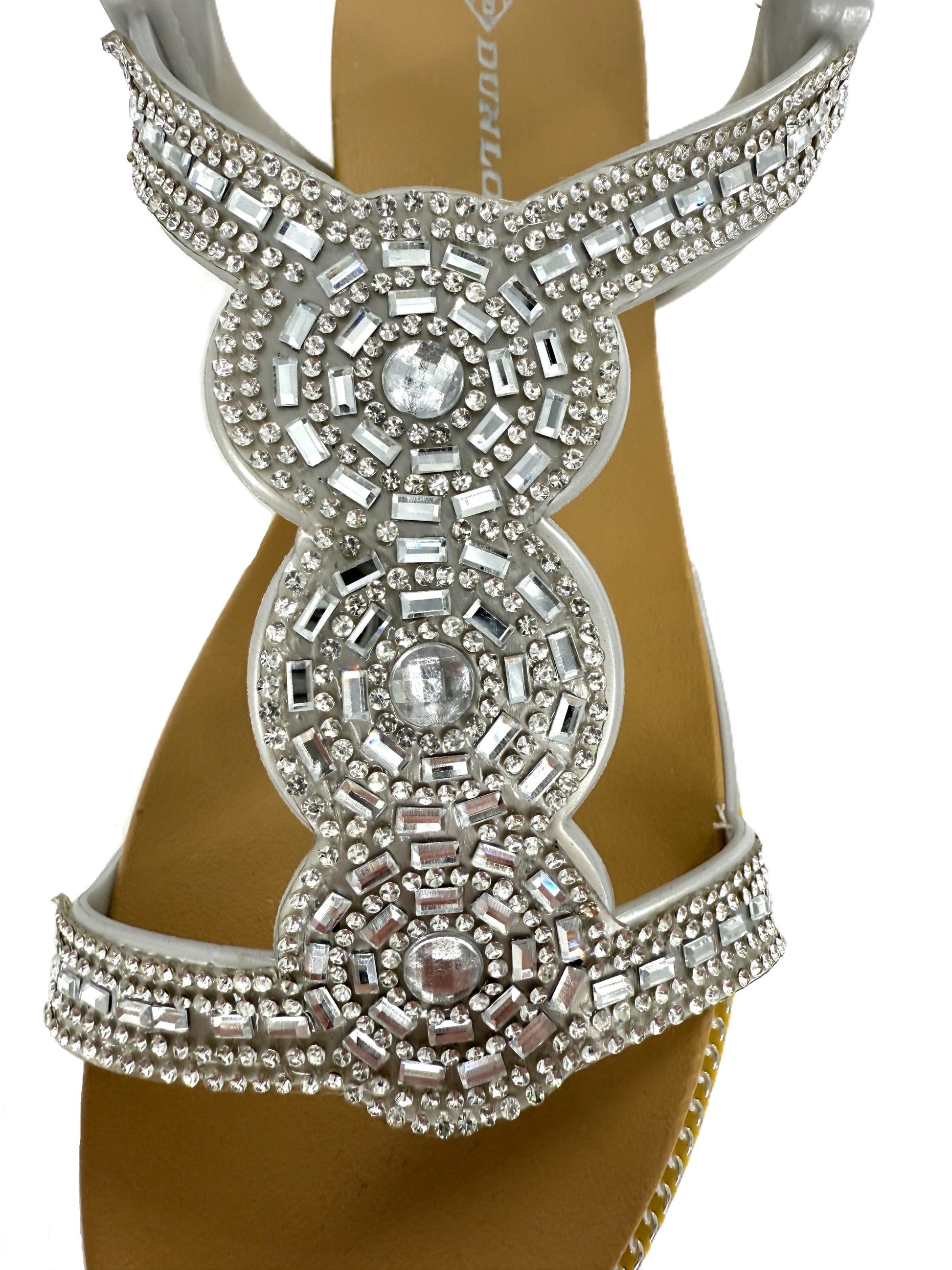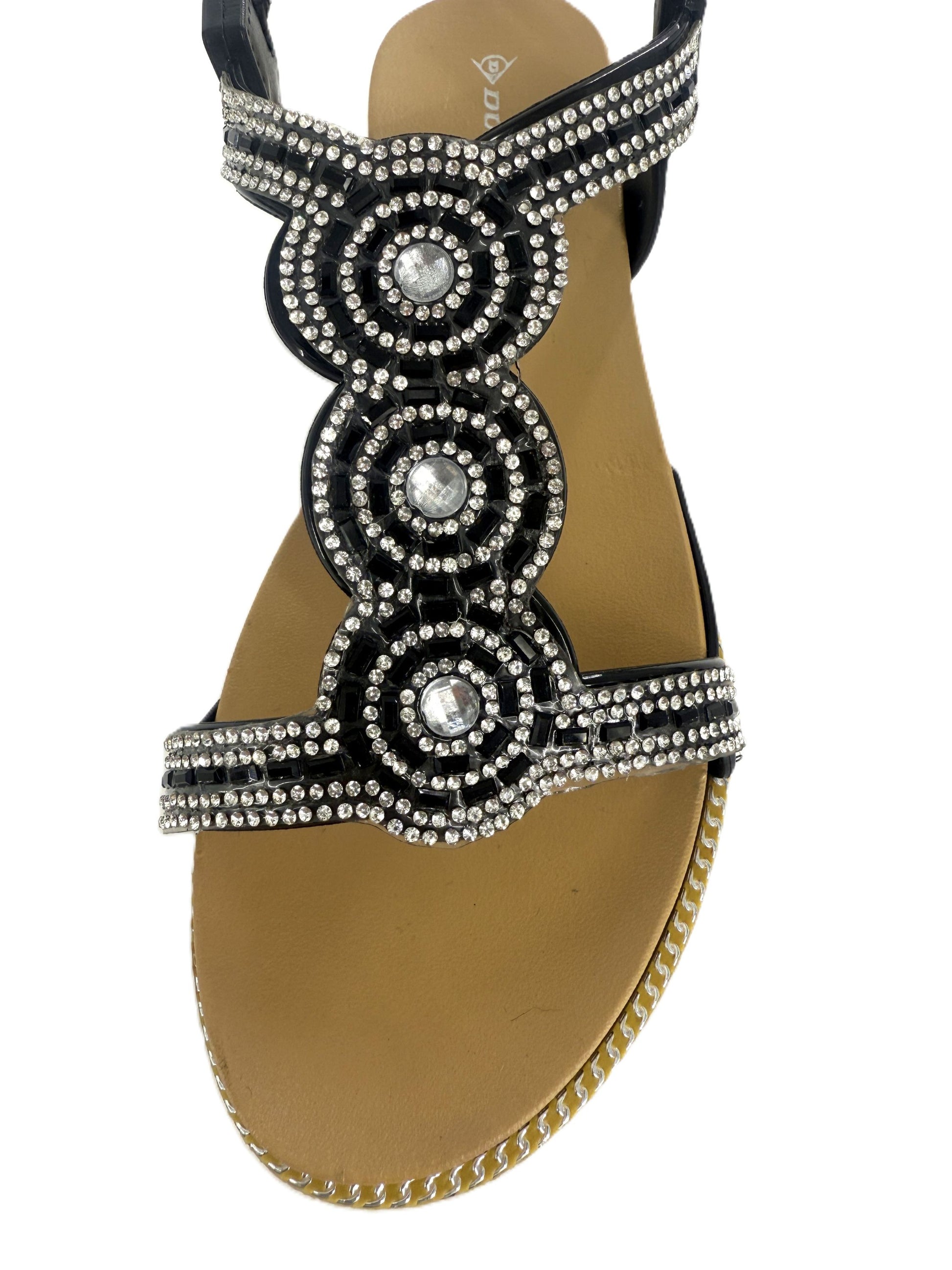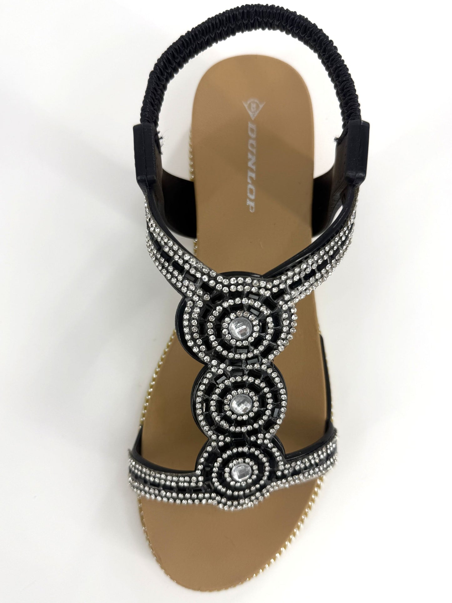 Dunlop Ladies Jewelled Summer Sandals – Black or Silver – Comfortable Flats with Cushioned Footbed and Elastic Back Strap
