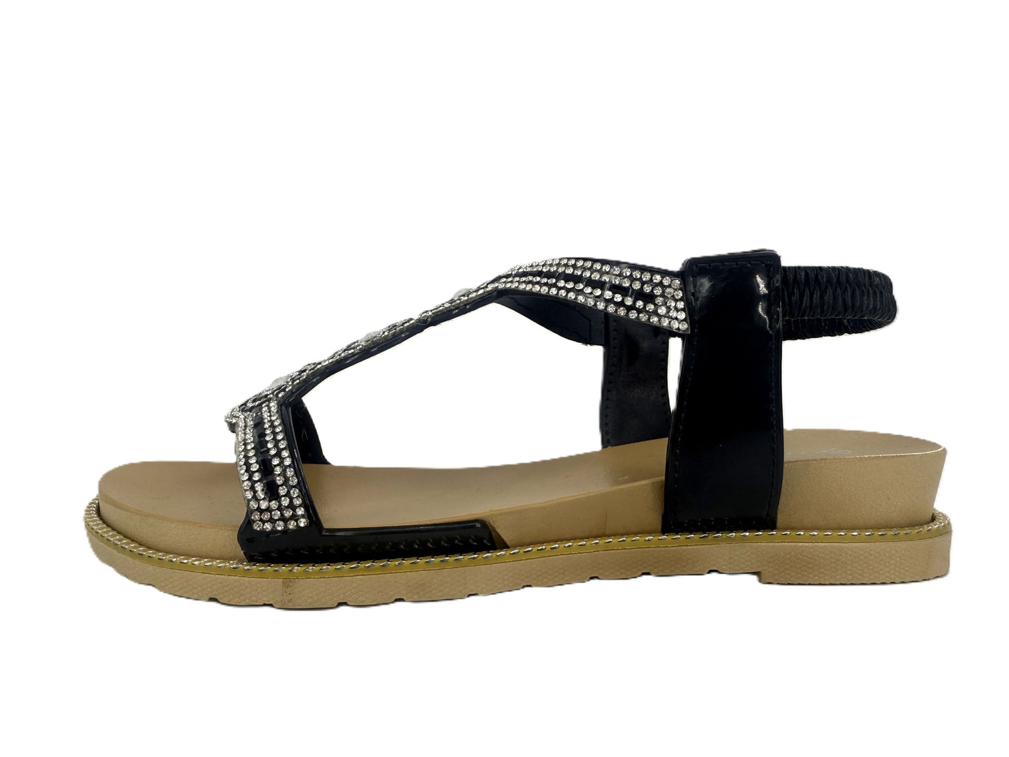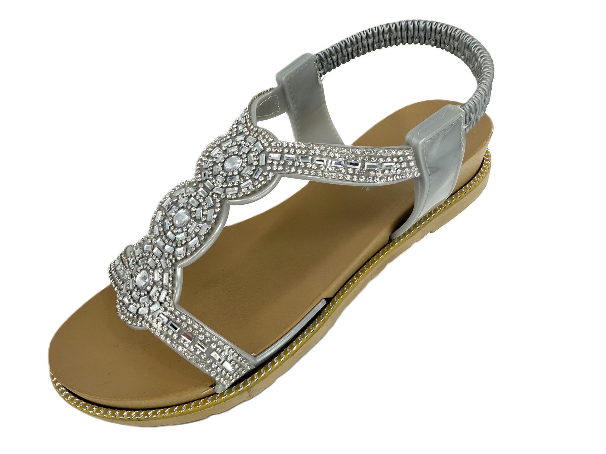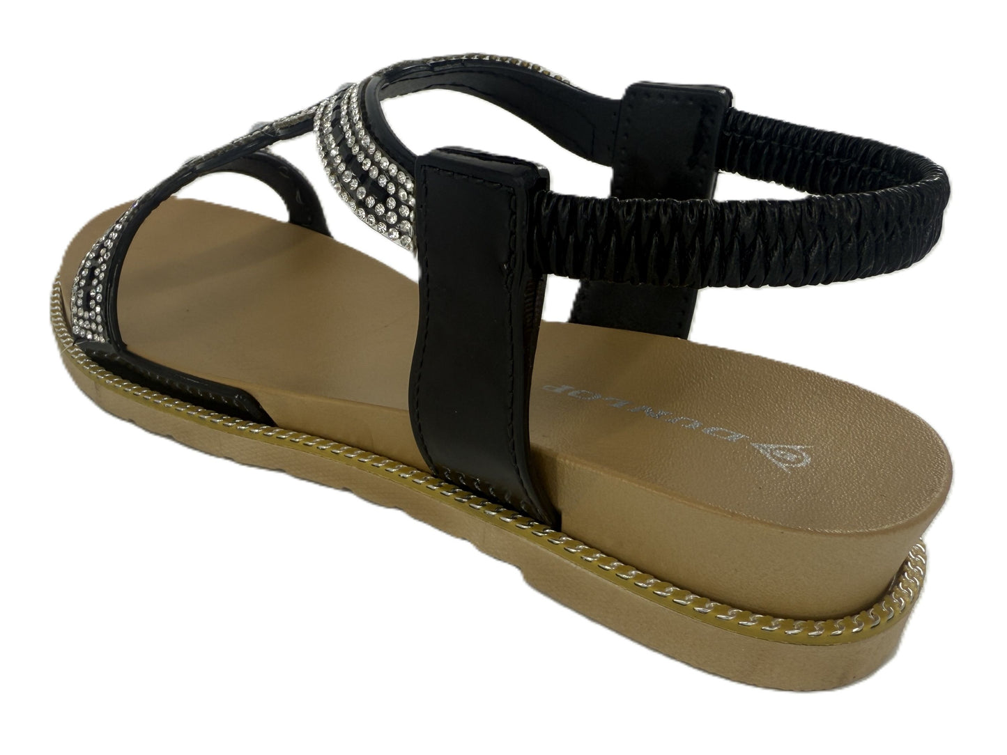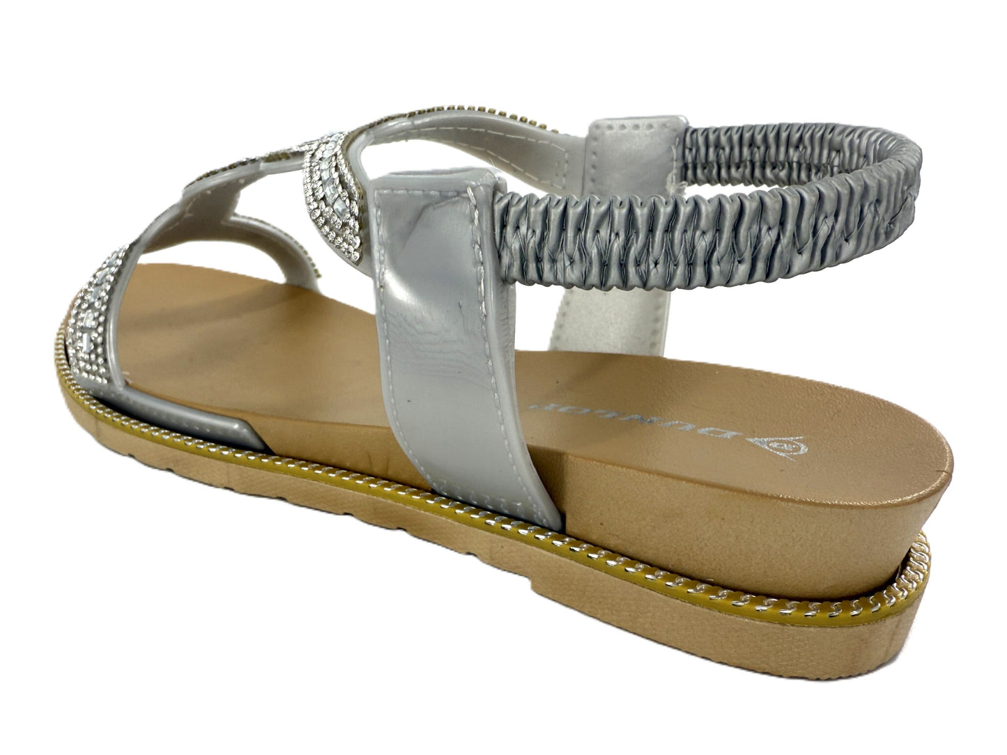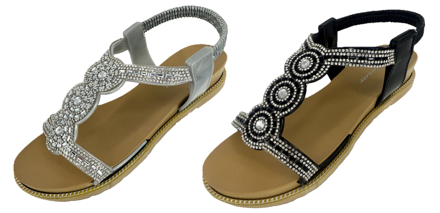 Dunlop Ladies Jewelled Summer Sandals – Black or Silver – Comfortable Flats with Cushioned Footbed and Elastic Back Strap