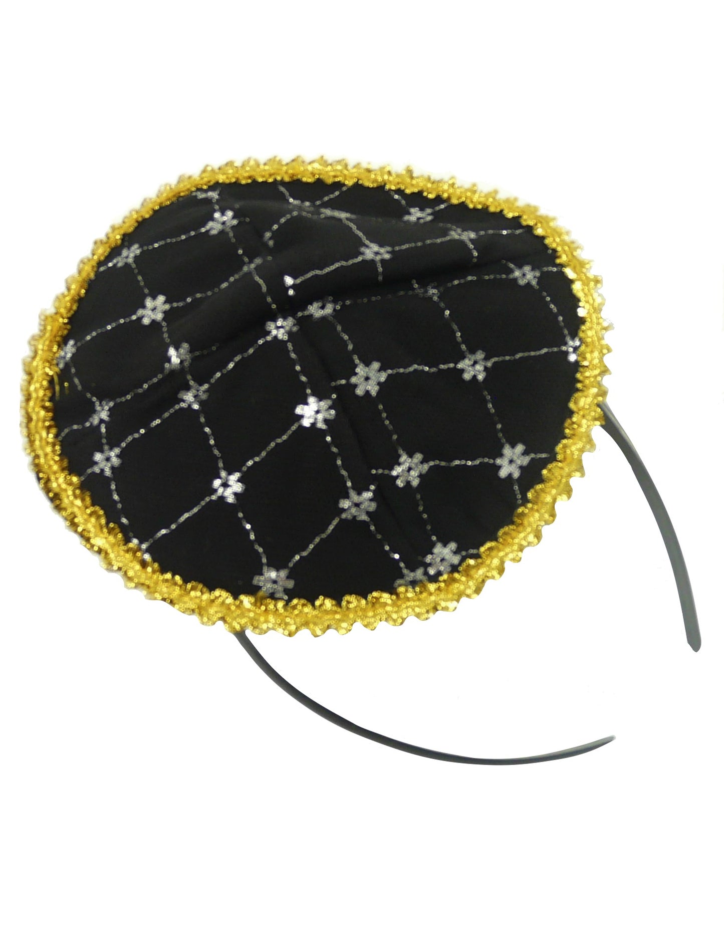 The headpiece, is a small black hat, again covered with the silver and gold netting. This is kept in place by a simple black headband.