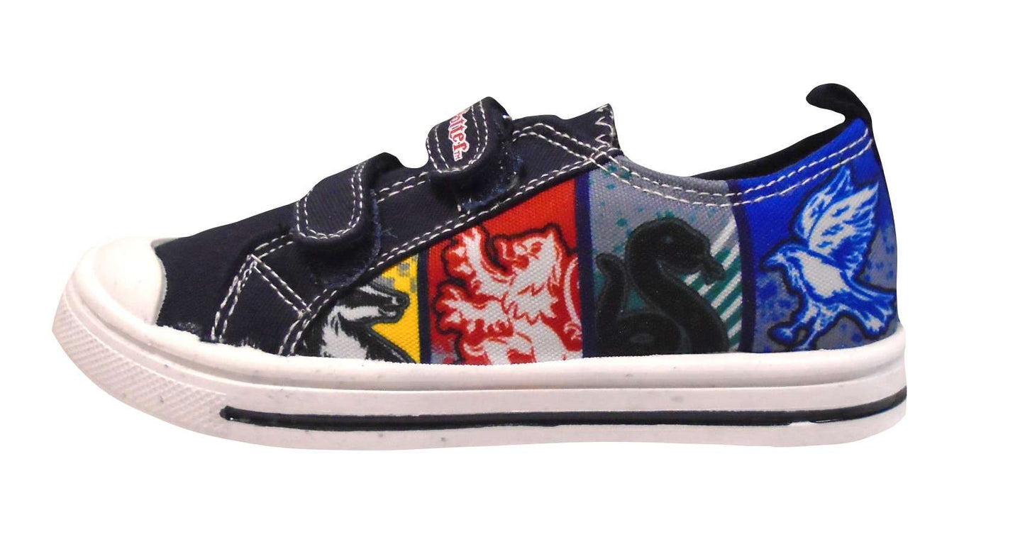Harry Potter "Houses" boys summer canvas pumps. Great Harry Potter Pumps with the embalms of the 4 houses of Hogwarts, Gryffindor Slytherin, Ravenclaw and Hufflepuff. Navy blue With pull over Adjustable Hook & Loop Velcro fastening and rubber soles made from synthetic manmade material Available in a Size UK range of UK 8 / EU 26 – UK 2/ EU 36