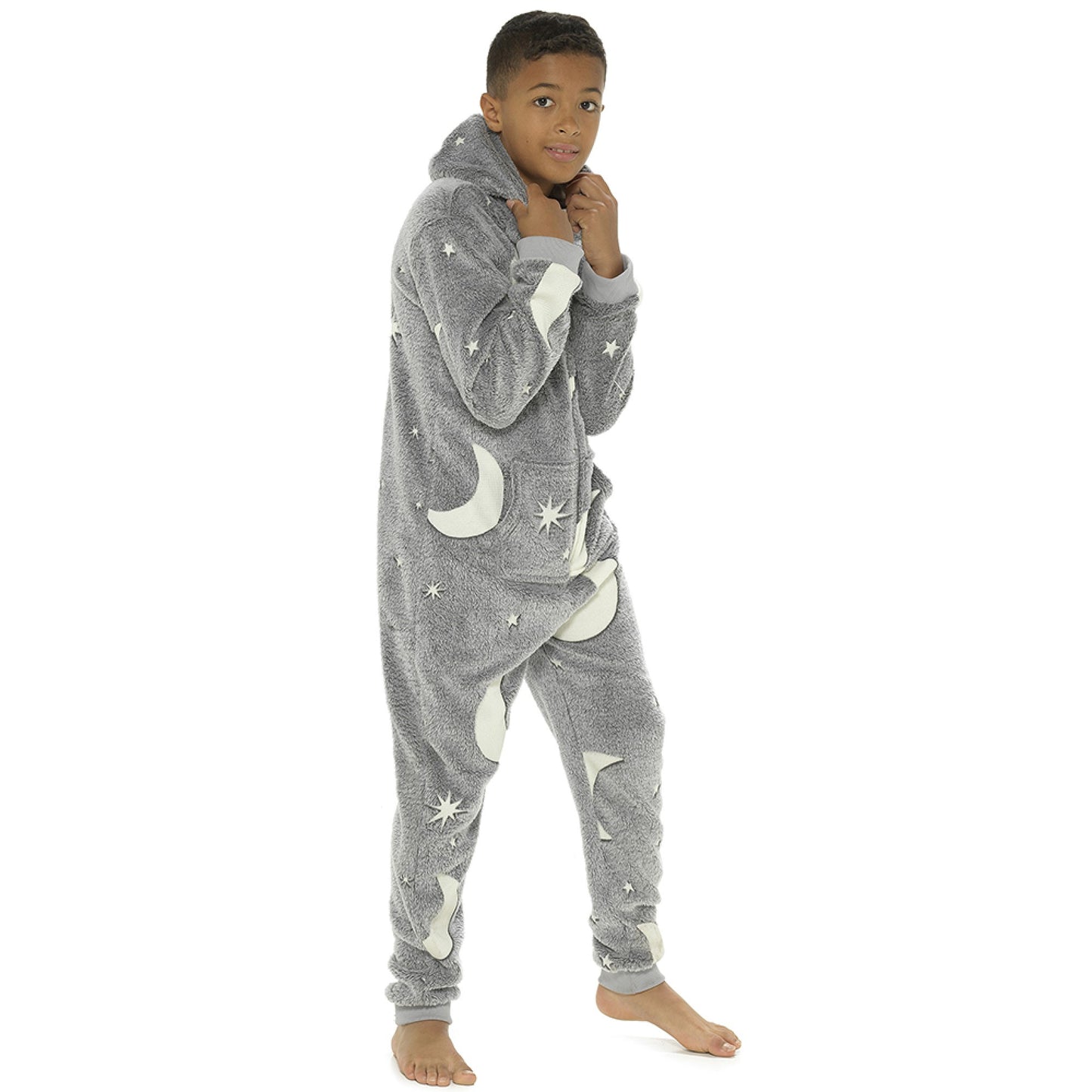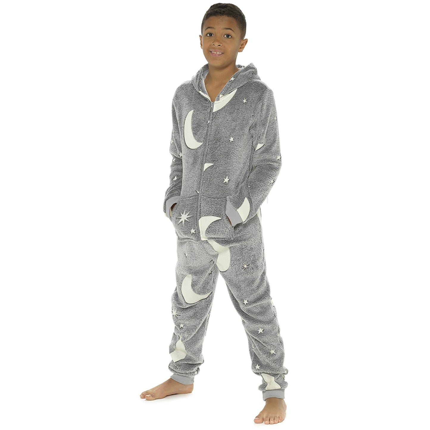 • This cuddly onesie will make sure your youngster stands out from the pack! The soft hooded fleece onesie features a zip-up front and an all-over glow-in-the-dark design. Plus, its soft, long-sleeved and long-legged construction will keep them warm and cosy. Get ready to shine night or day!