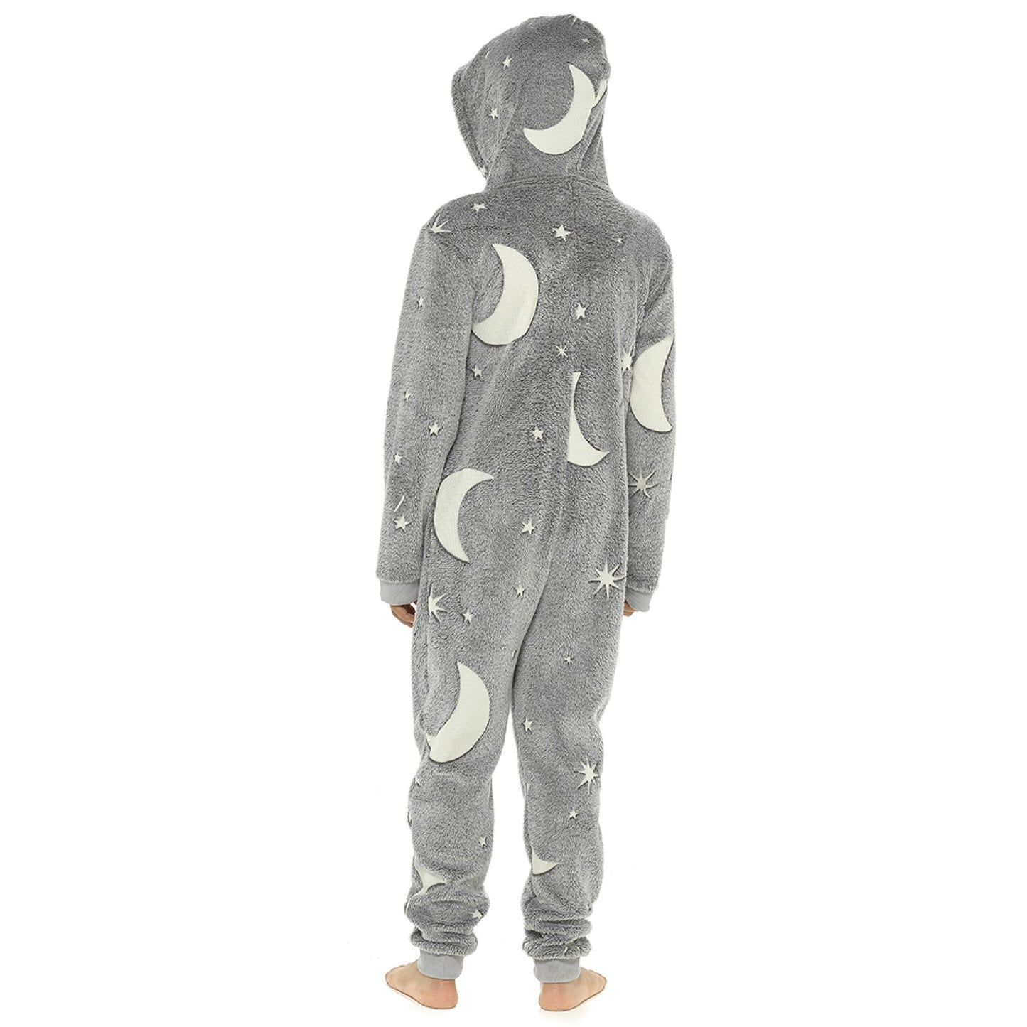 • Soft cosy fluffy fleece onesie with hood, long sleeves, long legs and zip-up front. All over cream coloured design which glows-in-the-dark (expose to a bright light or daylight for 12 hours, then turn the light off at night to see the design glow)