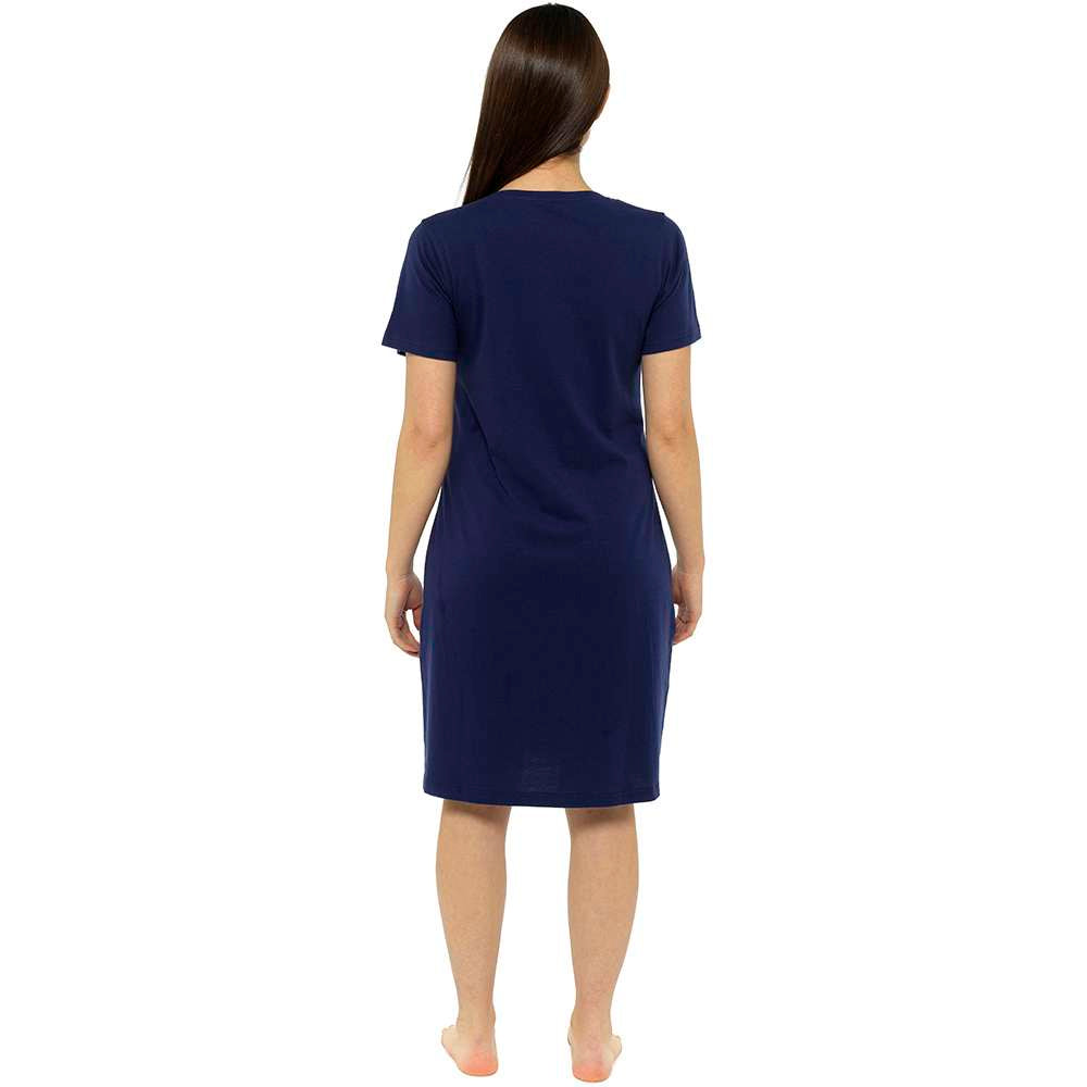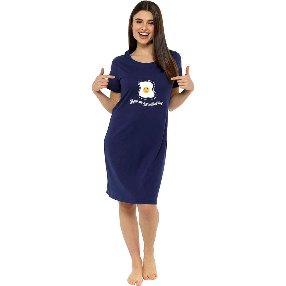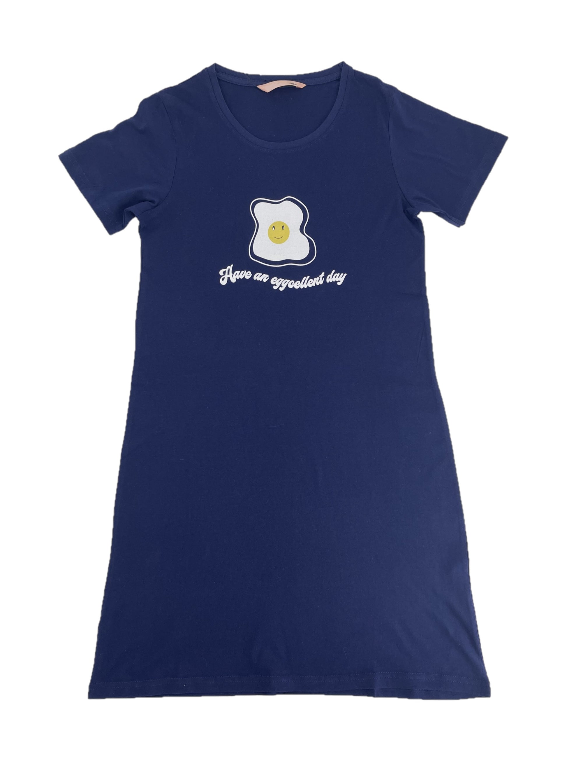 Ladies "Eggcellent Day" Short Sleeve Nightie, ideal for the warmer summer months. This lovely relaxed fit nightie is made from 100% Cotton. The nightwear are made from dark navy blue cotton, whilst the front has a fun picture of a fried egg and the phrase “Have an eggcellent day” written below the heatseal print image. The nightie is short sleeved, and is designed to finish around the knee (depending on your height),