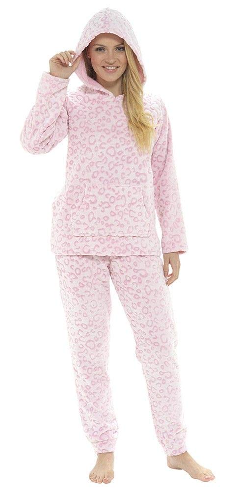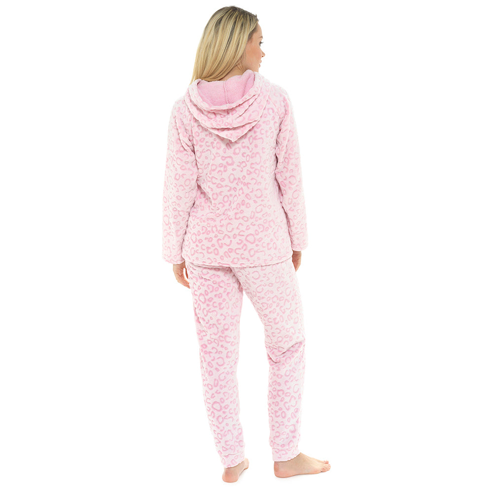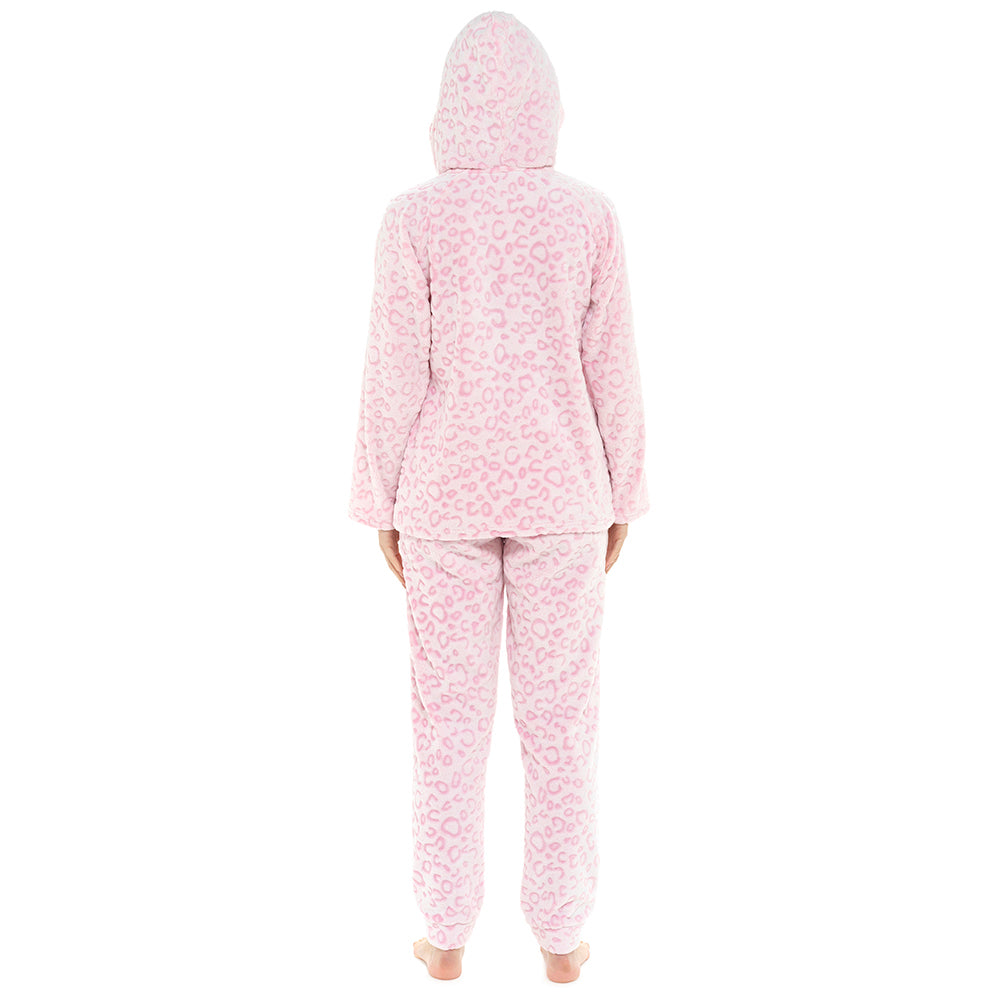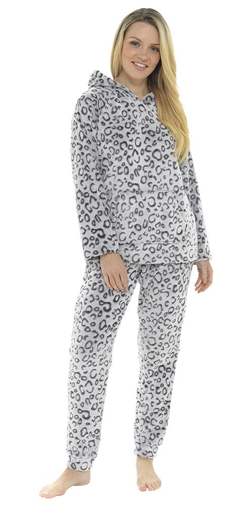 Ladies Leopard Print Fleece Hooded Twosie Pyjama Set in Grey or Pink