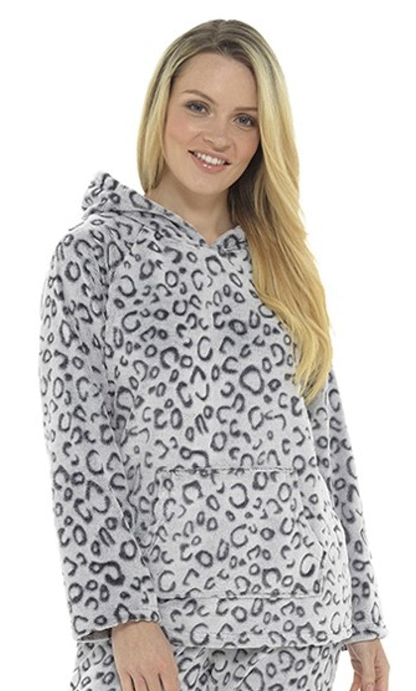 Ladies Leopard Print Fleece Hooded Twosie Pyjama Set In Grey Or Pink