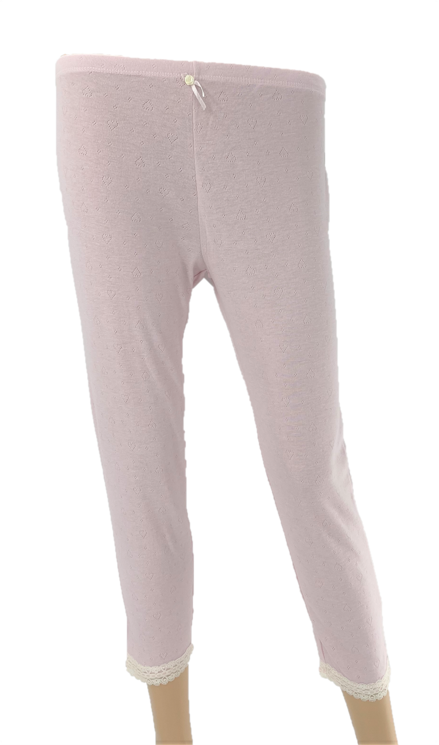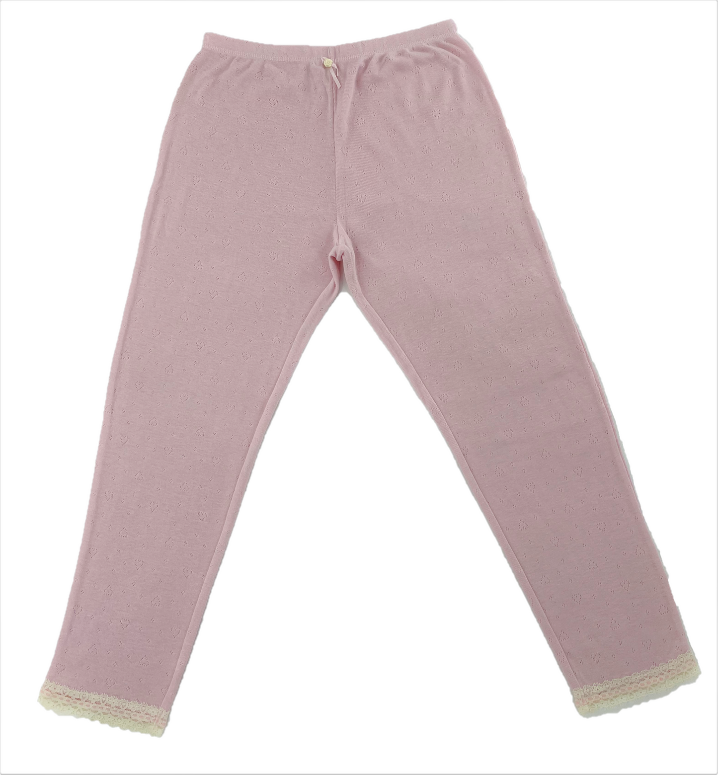 These soft cotton blend jersey pants will keep you warm in colder weather - ideal for wearing as a base layer for winter walks, skiing, snowboarding, or sledging. All-over integral heart pattern and pretty lace trim. Thermal long johns with elasticated waist and lace-trimmed leg cuffs. 65% Polyester, 35% Cotton - machine washable. Available in colours Black, Pink, or Grey and UK Sizes 8-10, 12-14, 16-18