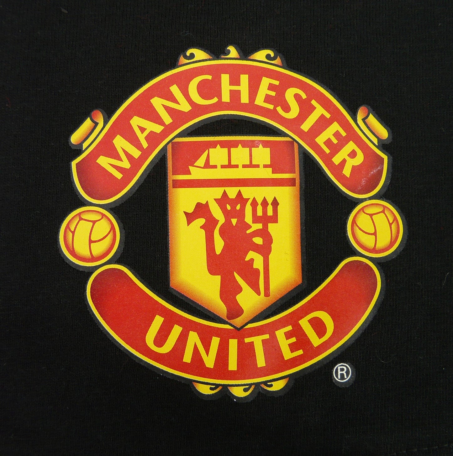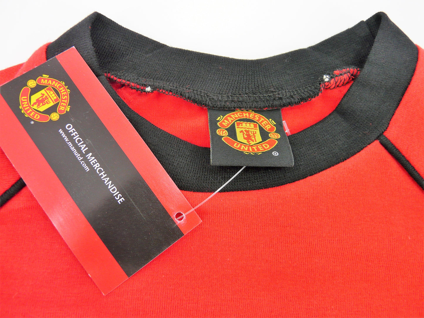 There is a heat seal transfer on the front of the famous MUFC logo, surrounded by the words MANCHESTER UNITED written in striking font. There is a black stitched in tag at the neck with the logo embroidered in, and on the back the words Official Merchandise.