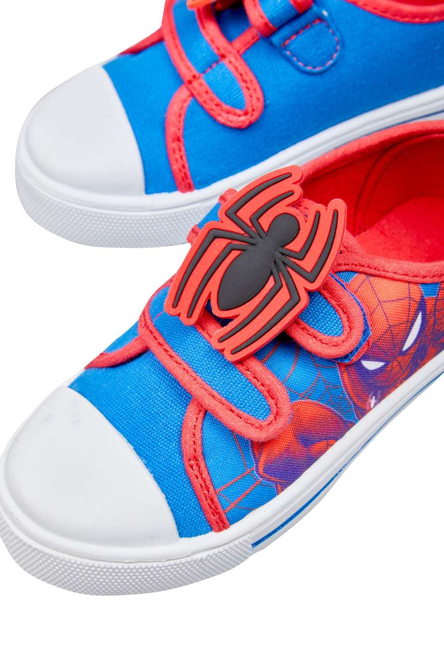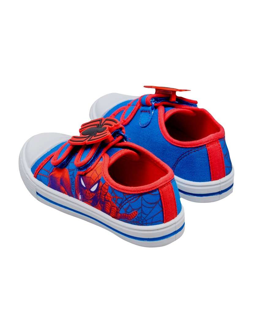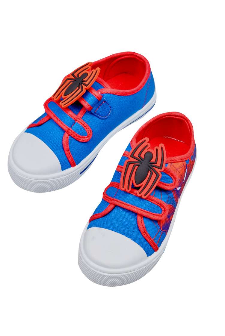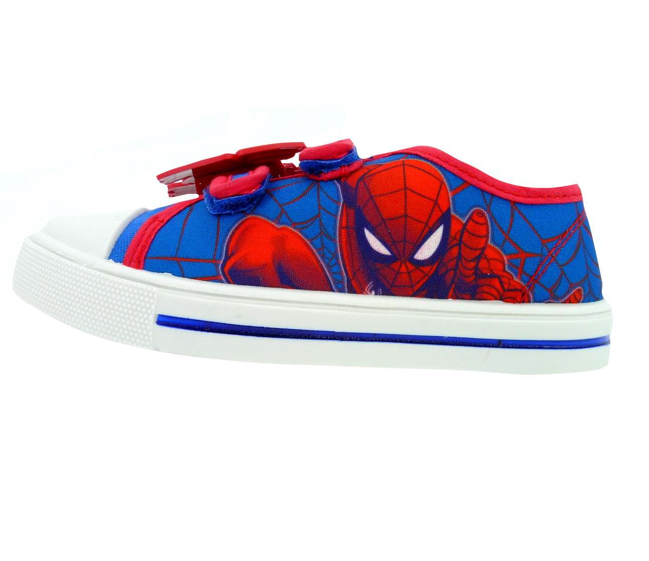 Officially licensed Spiderman boys easy close canvas shoes. Blue canvas uppers with red trim and multicoloured Spiderman design to the outer sides. Twin adjustable touch-and-close straps with a detachable soft plastic spider badge on each shoe. Non-slip white outsoles which cover the toe area. Cushioned insoles. Your young Spiderman fan will be delighted with these canvas shoes - perfect as a gift, for holidays, and for general wear in warmer months. Available in UK Child size 10 - 2.