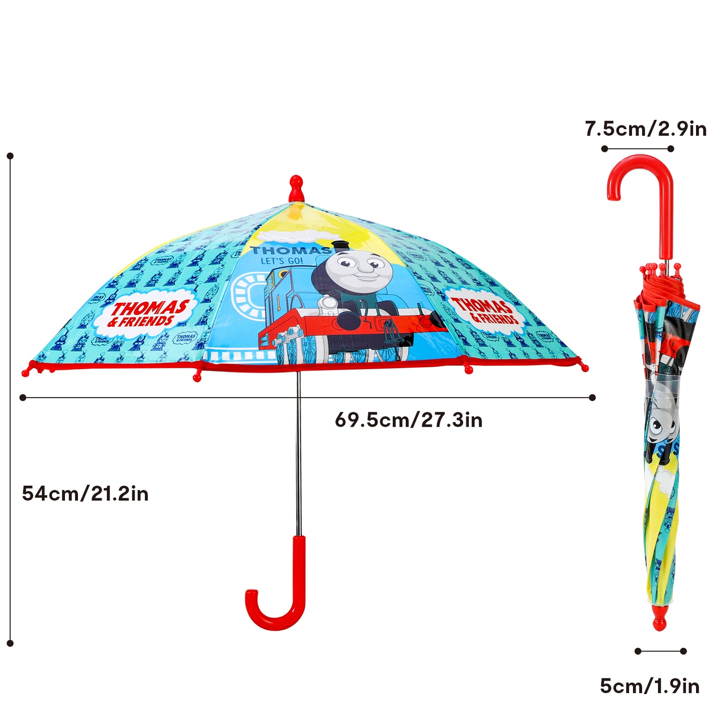 The umbrella has 8 panels featuring a smiling Thomas. The metal shaft has plastic red handle and is easy to put up and down.
