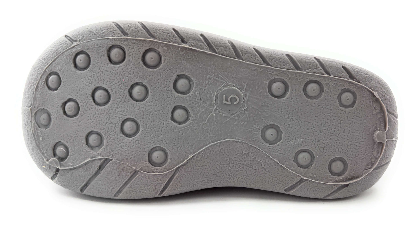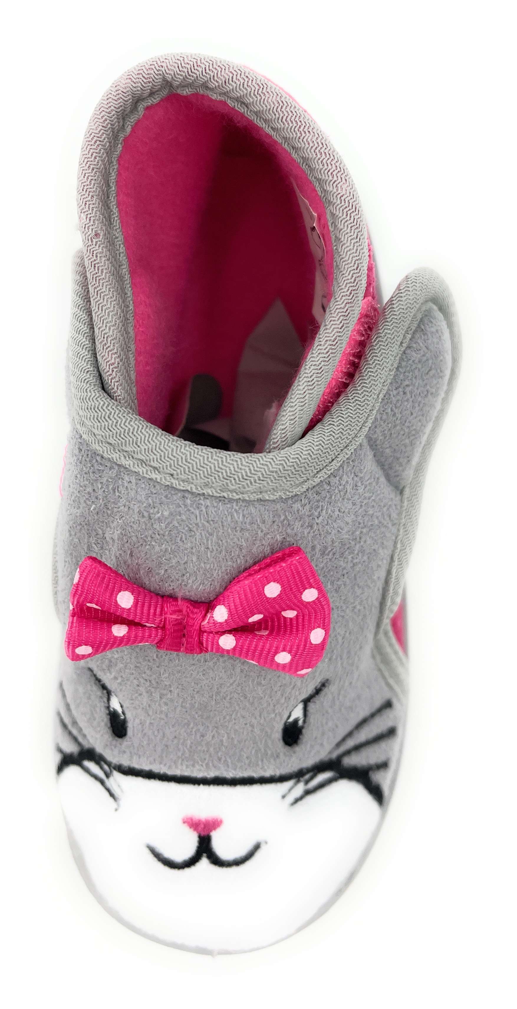Your little girl will love these cute warm bootie slippers featuring a cat face on the front - the touch and close fastenings make them easy for little hands to put on and take off. Soft cushioned velour uppers with pink and white polka dot patterned back and grey and white front with embroidered cat face design and cute pink and white polka dot bow. Adjustable easy close fastening. Cushioned insoles and soft grey rubbery non-slips soles. Available in UK Child Shoes Sizes 4, 5, 6, 7, 8, 9, 10.
