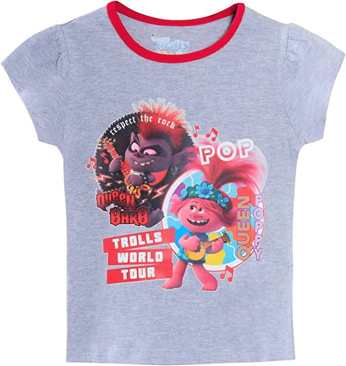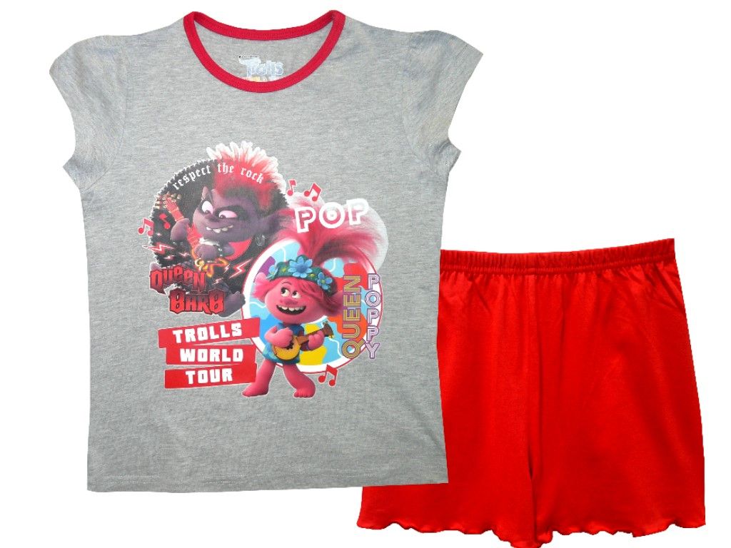 DreamWorks Trolls 2 World tour multicoloured short and T-shirt pyjamas are great soft pyjamas set perfect for any Trolls fan. The grey top has short sleeves with a fabulous image of Princess Poppy rocking out with Queen Barb with the words “respect the rock” and Trolls world tour. The red pyjama bottoms are shorts with an elasticated waist and a frill edging. Perfect for holidays, the warmer months or if your little one just likes to keep cool, they can be worn all year round.